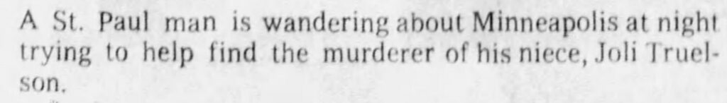 This was researched and written by Amy Pierce, with the help of the Truelson family. Please continue on to episode two about Joli’s uncle’s search for connections between her death and future Minneapolis victim Mary Schlais.